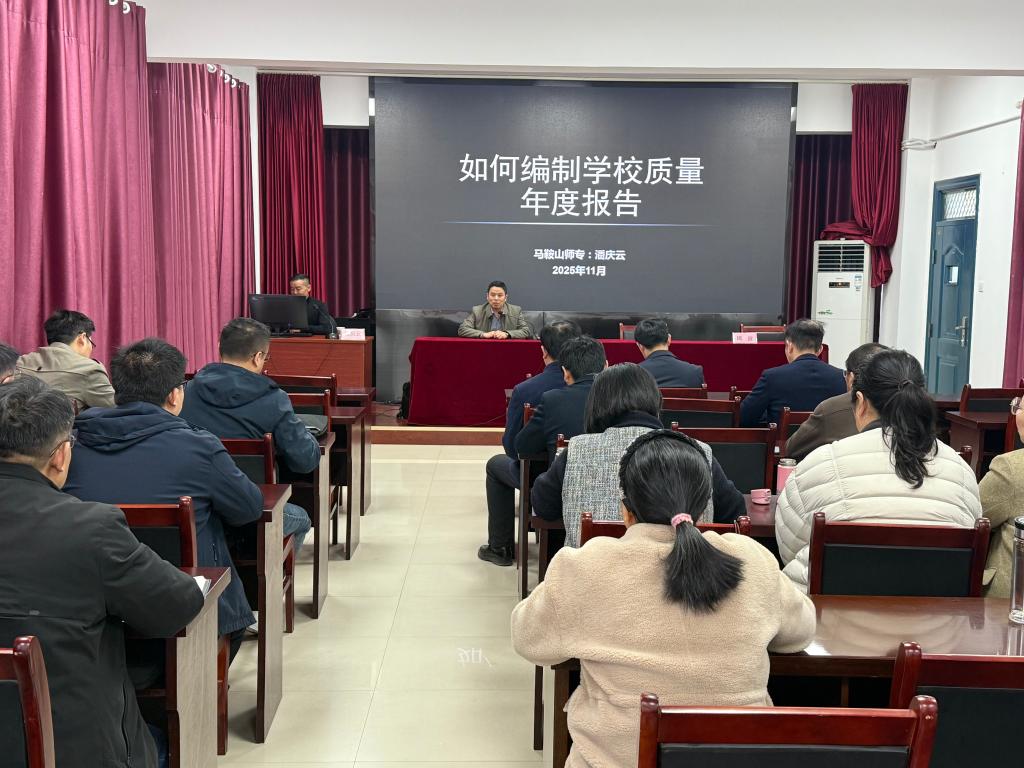 为提升学校质量年报编制的规范性与专业性,11月27日下午,学校在洞山校区4302培训教室召开质量年报撰写培训会,特邀马鞍山师范高等专科学校教务处处长、国家和省级质量年报撰写人潘庆云莅临开展专题讲座并现场指导。副校长凌总成,各单位(部门)负责人与质量年报材料具体撰写人齐聚现场,共同学习年报编制的核心要点与实操方法。会议由校长助理周波主持。