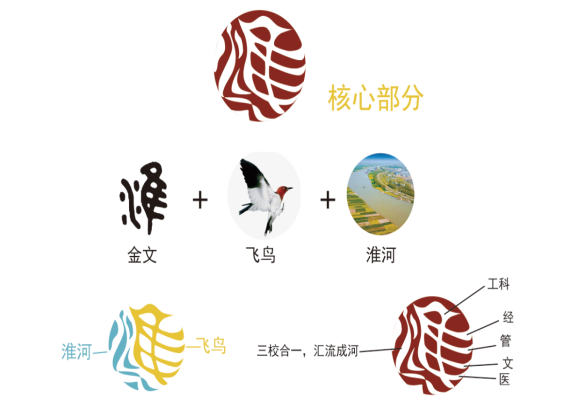 3.淮字三点水旁寓意三校合一,汇流成河,“隼”一纵四横寓意工科为主,经、管、文、医的专业特色和学科门类。