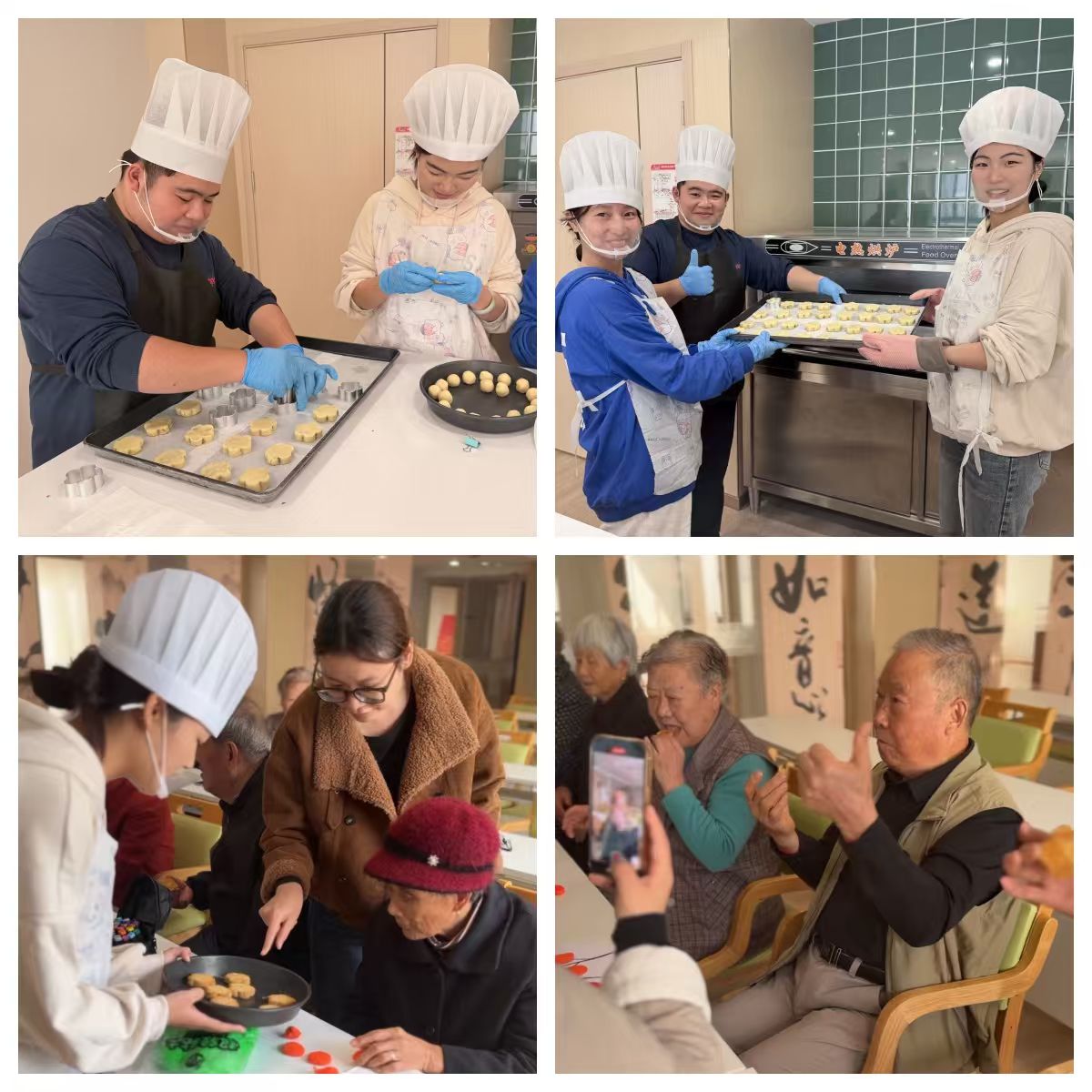 手作传情:互动课堂激发银发活力。烘焙教室内,白发与青丝相伴,药香与暖意交融。学生们分组带领老人从揉面、塑形到烘焙,细致讲解每一步骤背后的中医原理。“茯苓能宁心安神,山药适合脾胃虚弱者……”伴随制作过程的生动科普,让养生知识变得可触可感。81岁的李奶奶捧着成型的糕点欣喜地说:“孩子们教的不仅是手艺,更是健康生活的智慧!”