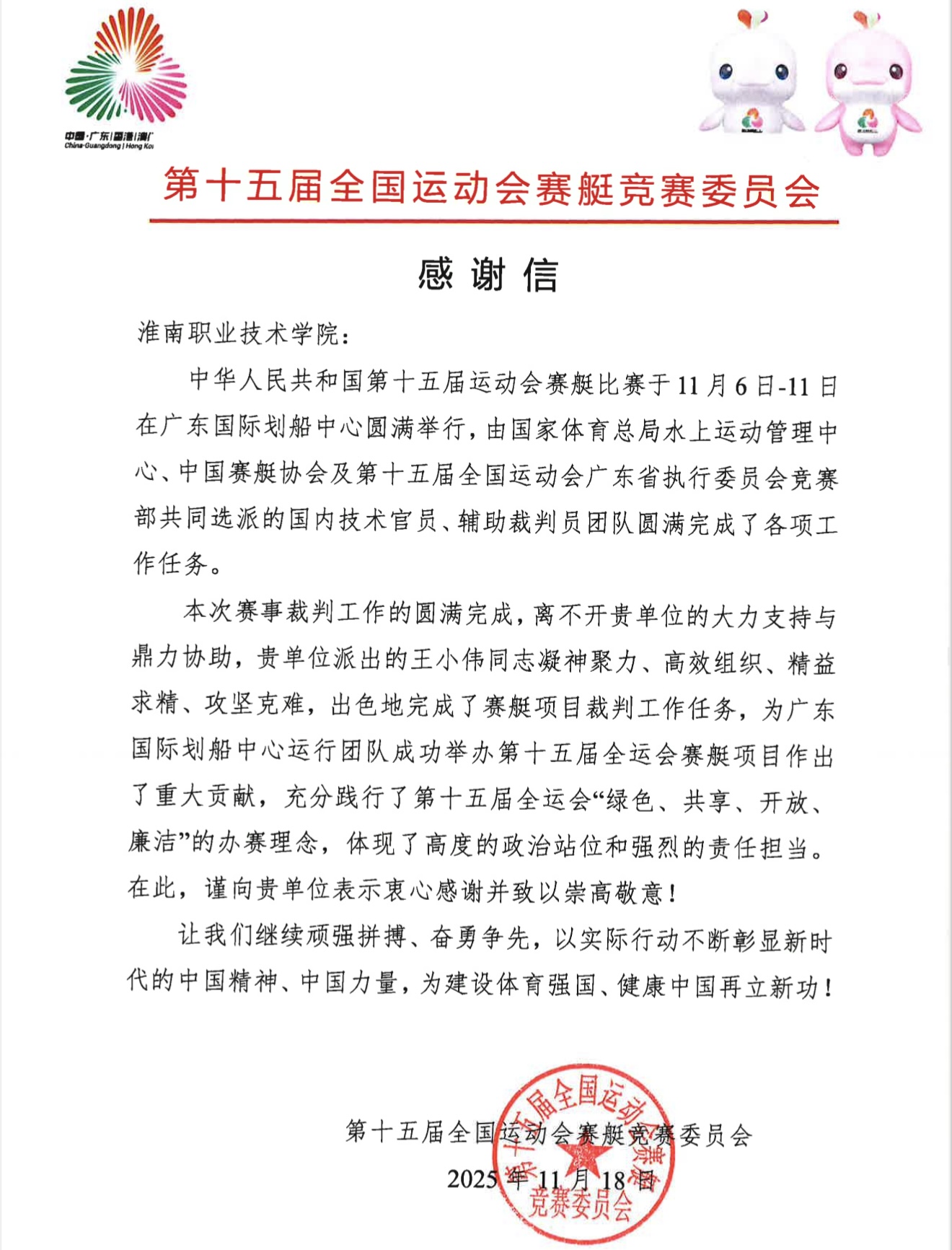 近日,第十五届全国运动会赛艇竞赛委员会向学校发来感谢信,高度肯定退休教师王小伟在赛事执裁工作中的专业表现。这既是王小伟个人专业素养的体现,更是对学校师资队伍建设与育人成果的肯定。