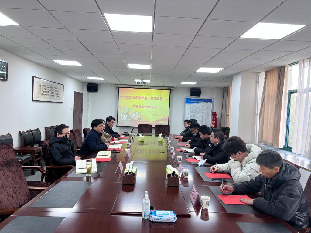 2月17日上午,合肥高新区人事劳动局就业处处长刘浩一行七人来我校考察交流,学校副校长胡道成在行政楼308会议室亲切会见来访客人。