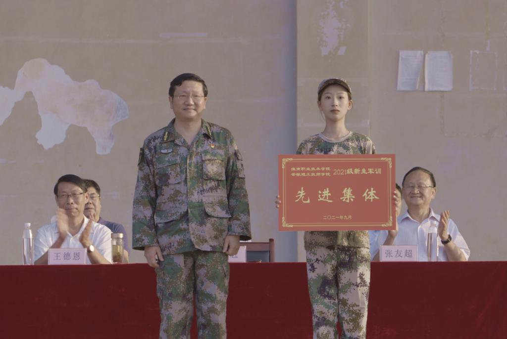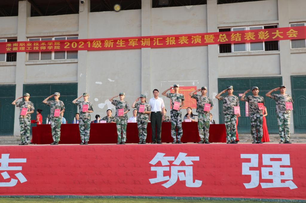9月29日下午, 2021级新生军训汇报表演暨总结表彰大会在田径场举行。淮河能源集团武装部副部长朱魁,学校党委副书记、纪委书记、工会主席张友超,党委委员、副校长王德恩出席大会。