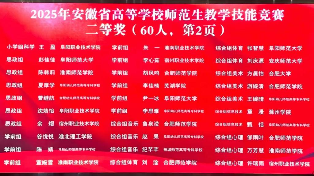 11月1日至2日,2025年安徽省高等学校师范生教学技能竞赛在合肥师范学院成功举办,本次大赛由安徽省教育厅主办,合肥师范学院和合肥市教育局承办。该赛事为安徽省级别和水平最高的师范生专项技能比赛,人文教育学院8名学子在学前组决赛与教具组比赛中展现扎实专业素养,分别取得两个二等奖和两个优胜奖的好成绩,实现能力与风采的双重展现。