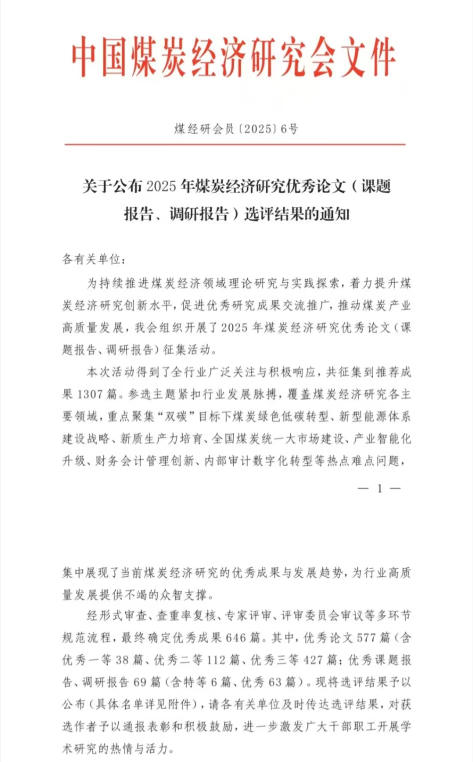 本次评选共收到来自全国煤炭企事业单位的1307篇成果,涵盖绿色转型、智能化升级等热点领域。经多轮严格评审,最终评选出优秀论文577篇,其中一等奖仅38篇,获奖比例不足3%,竞争激烈。
