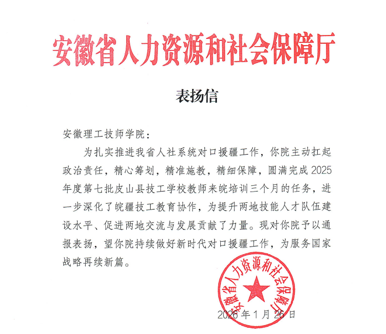 近日,安徽省人力资源和社会保障厅向安徽理工技师学院发来表扬信,对学院积极支持对口援疆工作,圆满完成2025年度第七批新疆皮山县技工学校教师来皖培训任务予以通报表扬。信中对学院在深化皖疆技工教育协作、提升两地技能人才队伍建设、促进民族团结与区域发展等方面所做的贡献给予高度评价,充分体现了学院在服务国家援疆战略中的责任与担当。